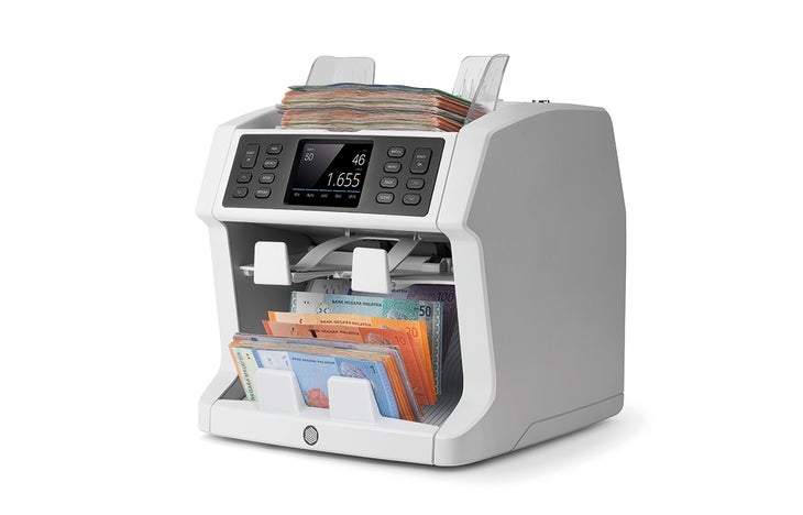 - Rapidly counts banknotes thanks to its large hopper capacity, double pocket design and continuous feeding